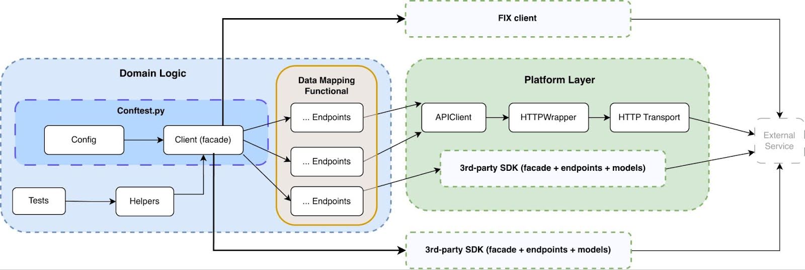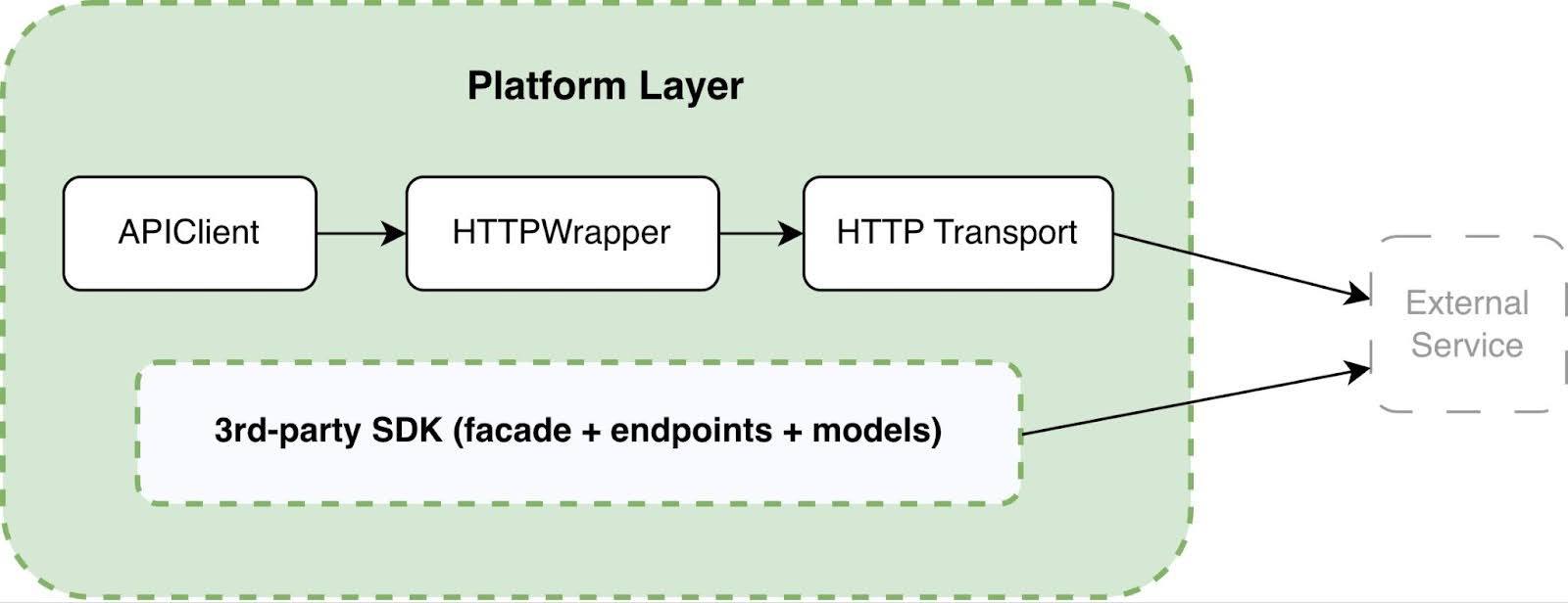 In the new architecture, we began treating SDKs as an alternative implementation of the external service interaction layer. They can either be plugged in through the platform layer or used directly in a strictly limited context. This allowed us to gradually transition to auto-generated SDKs, avoid rewriting automated tests and, where possible, eliminate duplicated logic.