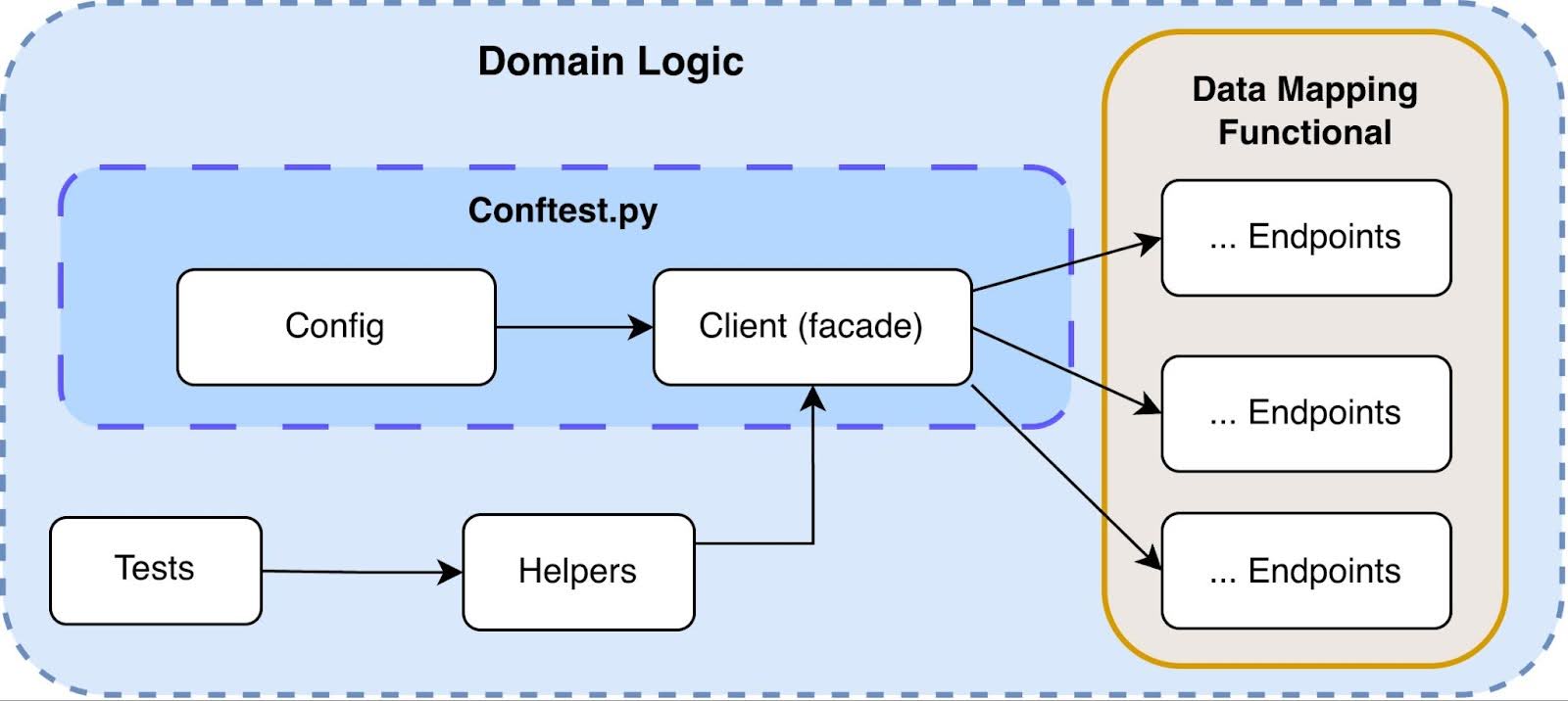 The domain layer became the entry point for tests and the single place where system behaviour is described. This zone contains tests, helpers, a facade, endpoints and data models. The purpose of the domain layer is to describe system behaviour in terms of business operations, not technical details. A test should not need to know which transport is used, how an HTTP request is formed, or how headers are handled.