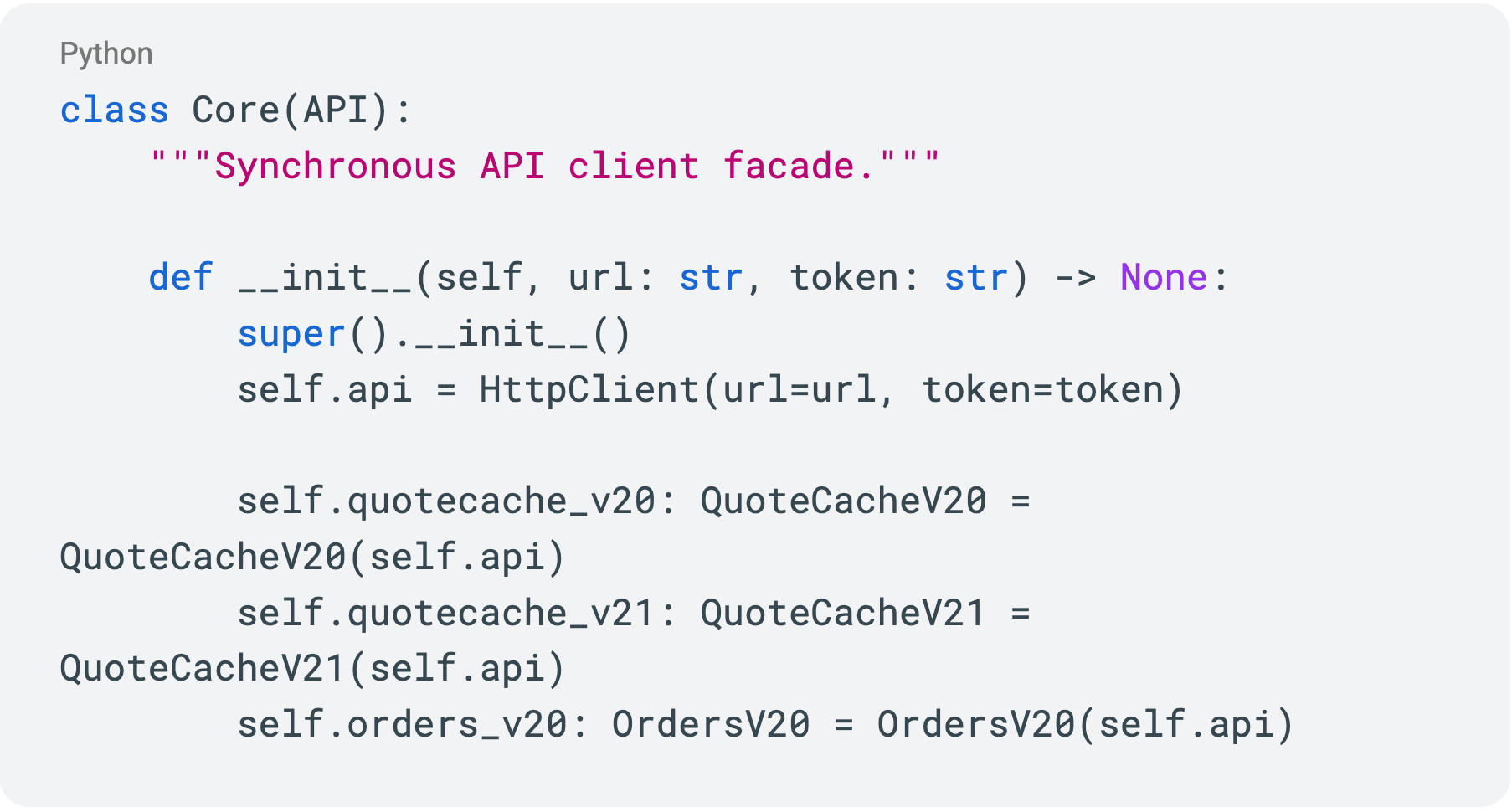 The Facade plays a central role. It acts as a stable contract to the service, expressed in terms of the domain model. The Endpoints layer is responsible for implementing specific API operations, including request/response mapping through models and interaction with the APIClient. It does not contain business logic or scenario coordination. The Models layer defines strict data structures (via Pydantic), providing typed request and response contracts as well as a unified serialisation and validation layer.