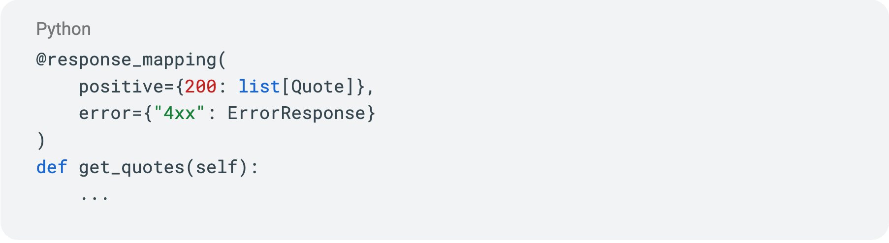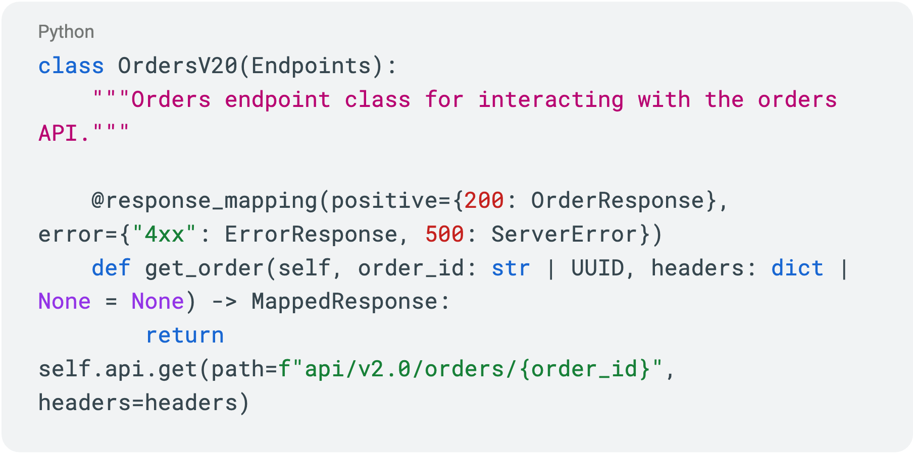 In the new approach, validation happens at the Endpoints layer. A @response_mapping decorator is added to each method of an Endpoint class, taking as arguments a set of positive and negative status codes along with data models for those responses. Status codes and data models are sourced from the service's Swagger specification.