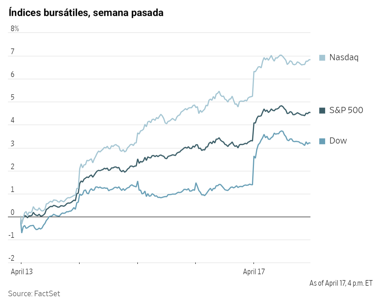 El viernes se produjo un sólido rally en la renta variable, que aseguró una tercera semana consecutiva de ganancias para los principales índices bursátiles, ante las señales de avance hacia una resolución del conflicto entre Irán y EE. UU.