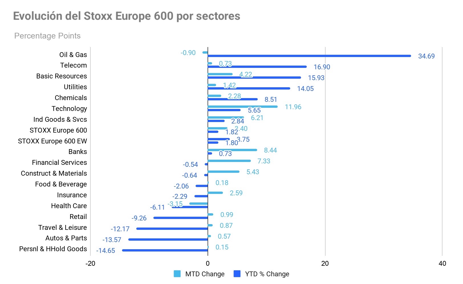 El sector de tecnología del Stoxx 600 lidera el rendimiento, con un alza del +11,96 % durante el mes y del +5,65 % en lo que va de año, mientras que el sector de salud ha registrado el peor comportamiento, con una caída del -3,15 % durante el mes y del -6,11 % en lo que va de año.