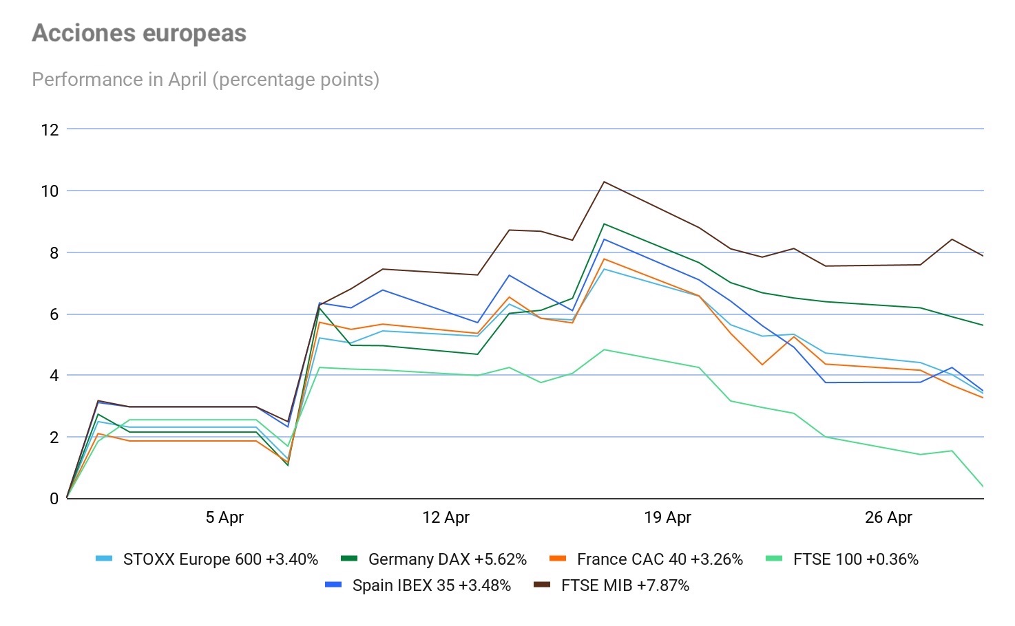 En Europa, la versión igualmente ponderada del Stoxx 600 ha subido un +3,75 % en lo que va de mes, 0,35 puntos porcentuales por encima del índice de referencia.