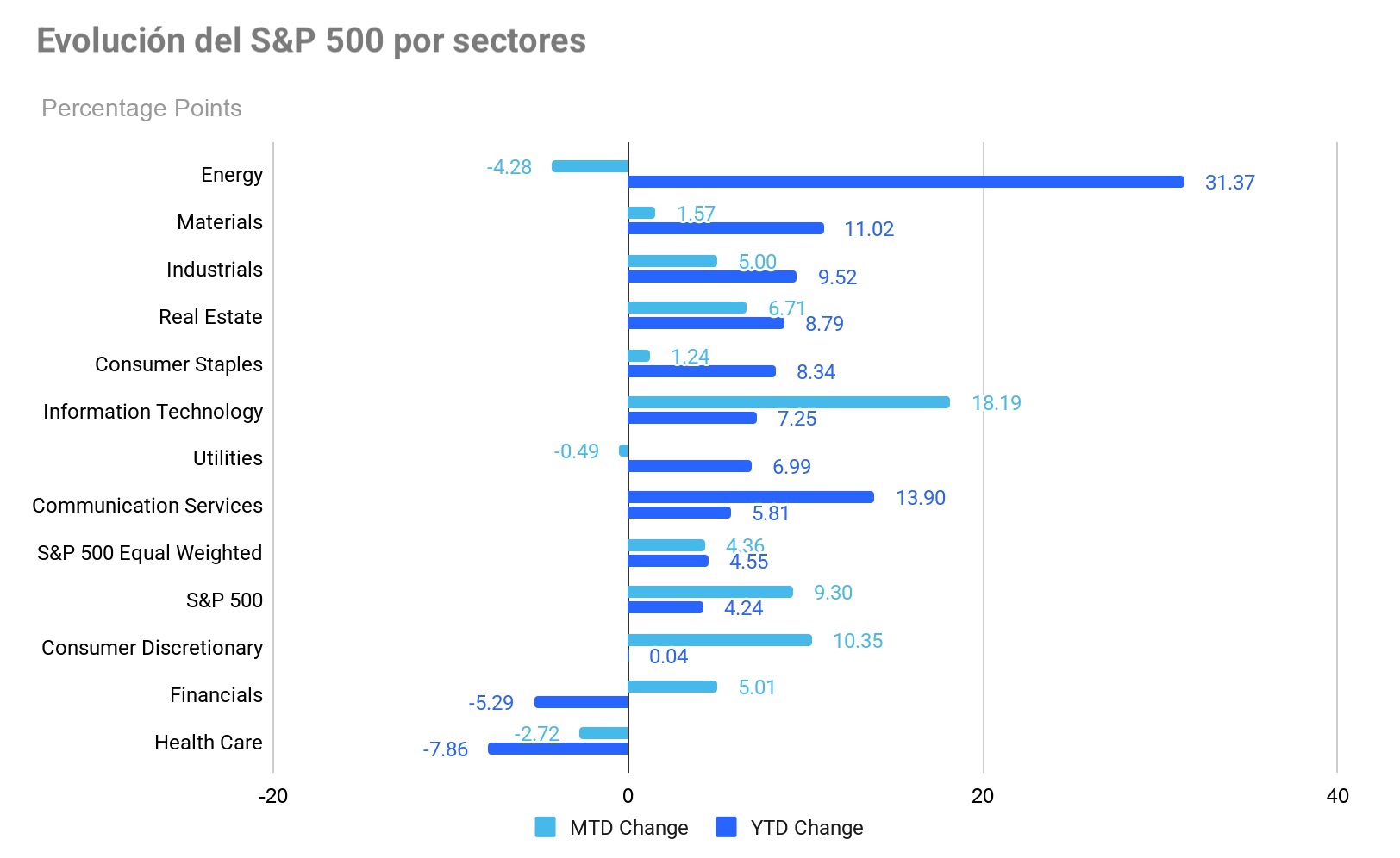 El S&P 500 +9,30 % en lo que va de mes y +4,24 % en lo que va de año
