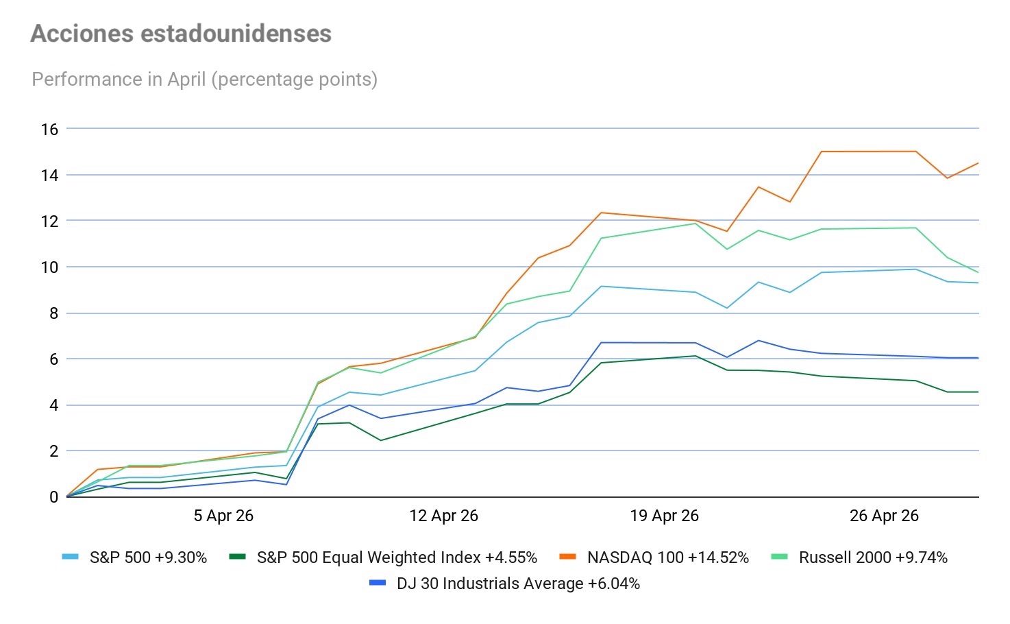 Abril ha sido un mes de máximos históricos para los mercados de renta variable de EE. UU., con el S&P 500 y el Nasdaq alcanzando nuevos récords impulsados por el avance generalizado de las grandes tecnológicas ante unas expectativas positivas de beneficios por acción. El rendimiento en lo que va de mes: el S&P 500 +9,30 %, el Nasdaq 100 +14,52 %, el Dow Jones Industrial Average +6,04 % y el Russell 2000 +8,86 %.