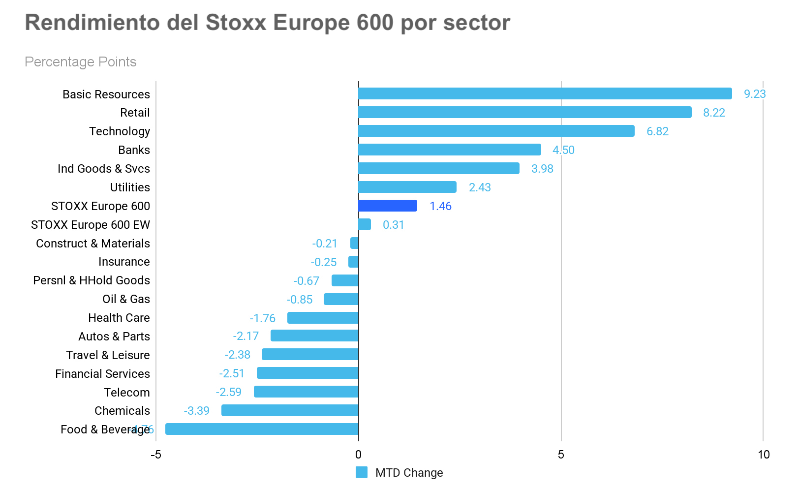 El Stoxx 600 Basic Resources es el sector líder, con un aumento del +9,23 % durante el mes, mientras que el de alimentación y bebidas ha sido el que peor comportamiento ha tenido, con una caída del -4,76 % en términos mensuales.