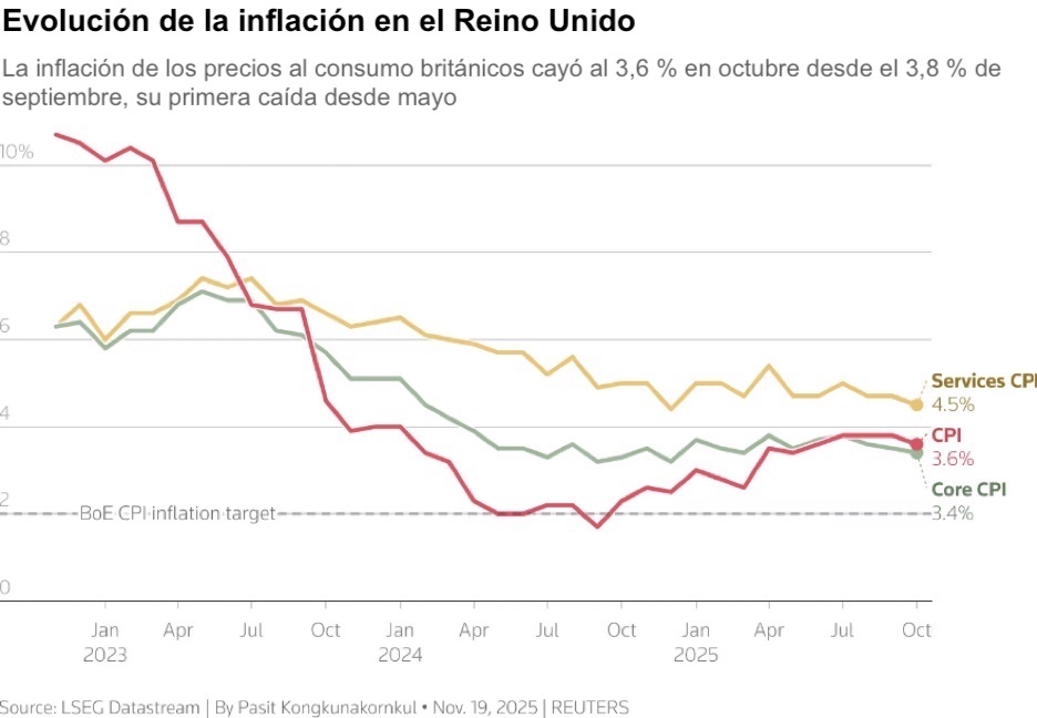 En el Reino Unido, los datos oficiales revelaron que la inflación de los precios al consumo se moderó hasta el 3,6 % en octubre, por debajo del máximo de 18 meses registrado en septiembre, del 3,8 %, en línea con las expectativas del Banco de Inglaterra. Esta moderación de la inflación reforzó las expectativas del mercado de que el Banco de Inglaterra recorte los tipos en diciembre.