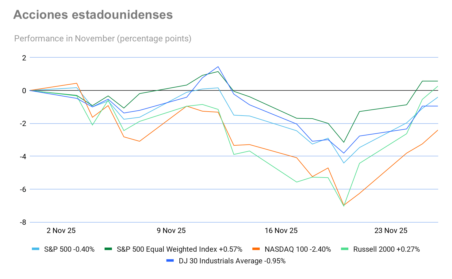 Las acciones de las empresas de gran capitalización han tenido un rendimiento desigual en lo que va de noviembre. Alphabet +13,78 % y Apple +2,66 %, mientras que Meta Platforms -2,27 %, Amazon -6,17 %, Microsoft -6,24 %, Tesla -6,57 % y Nvidia -10,98 %.