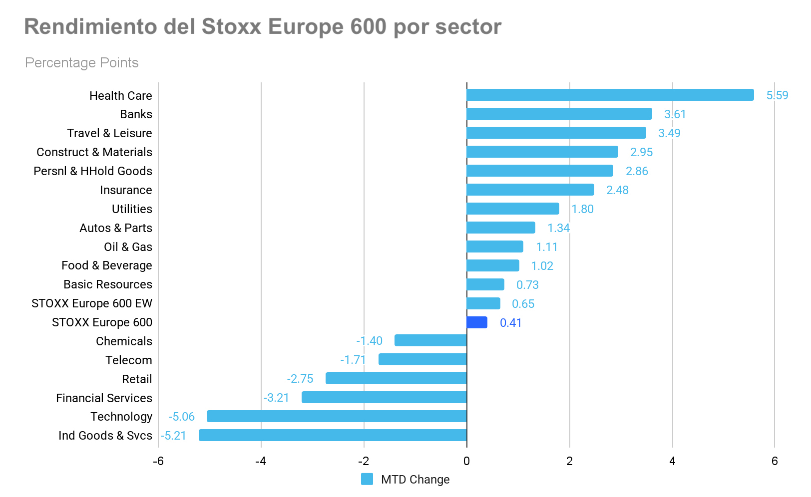 El Stoxx 600 Health Care es el sector líder, con un alza del +5,59 % durante el mes, mientras que los bienes industriales han registrado el peor rendimiento, con una caída del -5,21 % durante el mes.