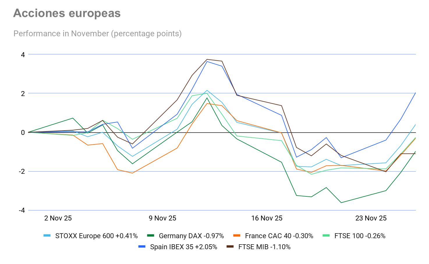 Los principales índices estadounidenses han registrado un rendimiento mayoritariamente negativo en lo que va de mes: el S&P 500 -0,40 %, el Nasdaq 100 -2,40 %, el Dow Jones -0,95 % y el Russell 2000 +0,27 %. Los mercados de bonos estadounidenses se han recuperado en toda la curva en noviembre, ya que las expectativas de que la Fed recorte los tipos en diciembre siguen creciendo tras el argumento a favor de una bajada del presidente de la Fed de Nueva York, Williams. Sin embargo, las primas de riesgo parecen estar aumentando, razón por la cual los inversores podrían empezar a centrar su atención en la duración. En Europa, los rendimientos de los bonos han aumentado ante las expectativas de que el Banco Central Europeo (BCE) haya completado su ciclo de recortes de tipos y ante los signos de recuperación económica.