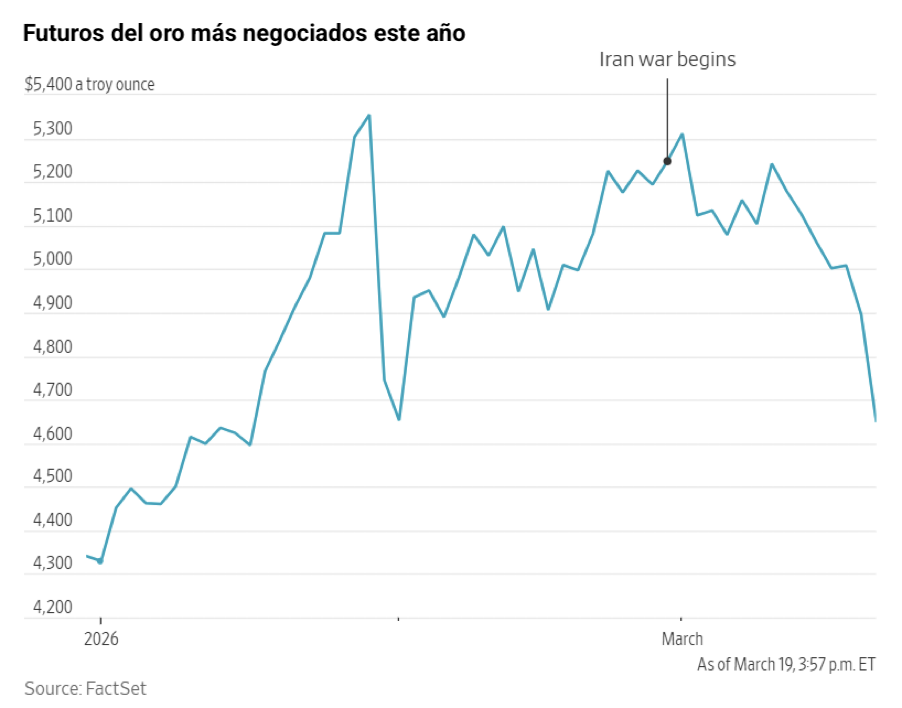 El oro al contado bajó un -3,42 % hasta situarse en 4.652,75 $ por onza, alcanzando su nivel más bajo desde principios de febrero.