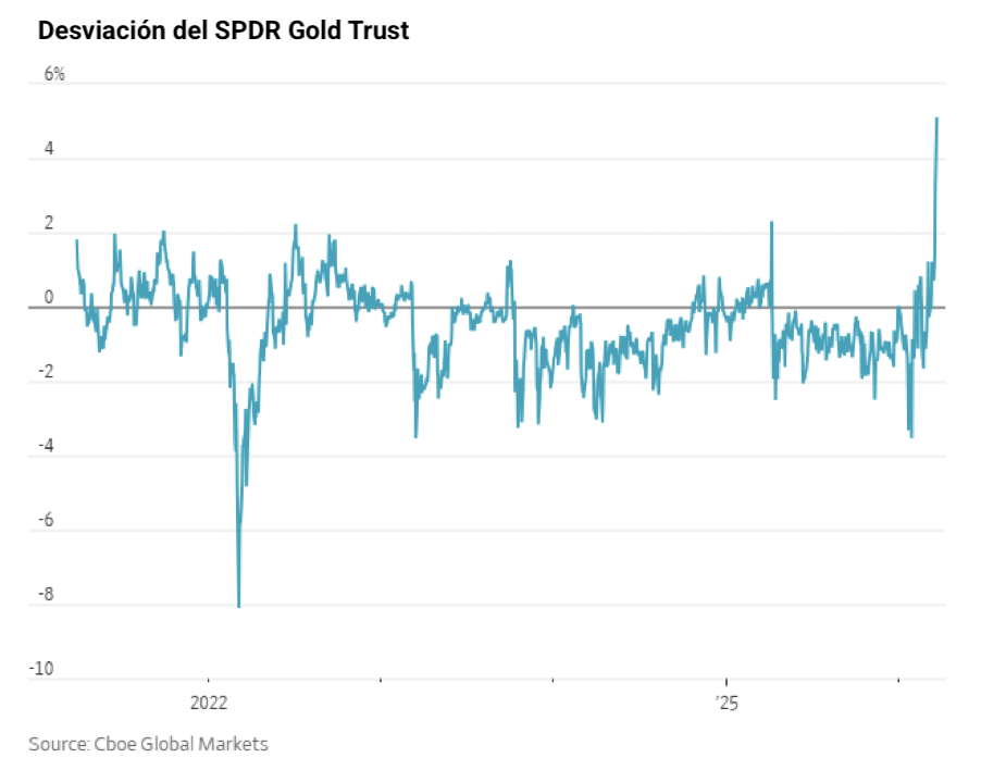 Según datos de Cboe Global Markets, la "curva de volatilidad" (skew) de las opciones vinculadas al mayor ETF de oro ha alcanzado su nivel más alto desde al menos 2021. Esta elevada skew indica que las opciones de venta bajistas están exigiendo primas más altas en comparación con las opciones de compra alcistas, lo que refleja una mayor demanda de protección contra las caídas. Las opciones de venta otorgan el derecho a vender a un precio específico, mientras que las opciones de compra otorgan el derecho a comprar.