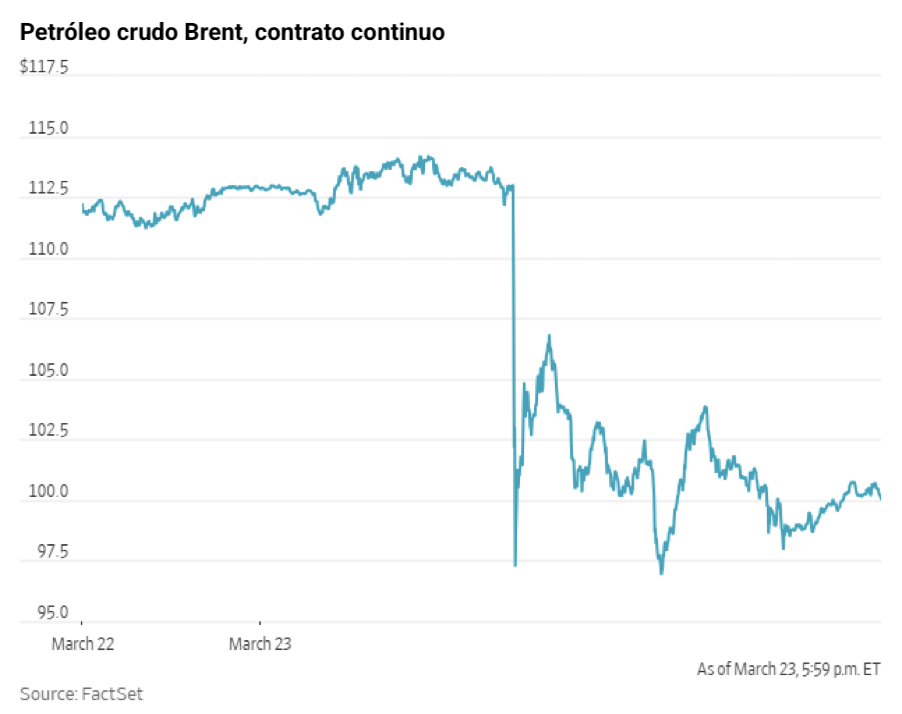Los futuros del Brent cayeron 9,49 $, o un -8,66 %, para situarse en 100,06 $ el barril, mientras que el WTI estadounidense perdió 9,60 $, o un -9,72 %, hasta situarse en 89,21 $.
