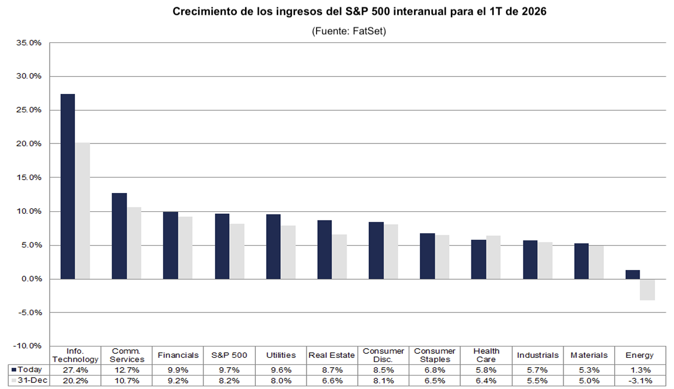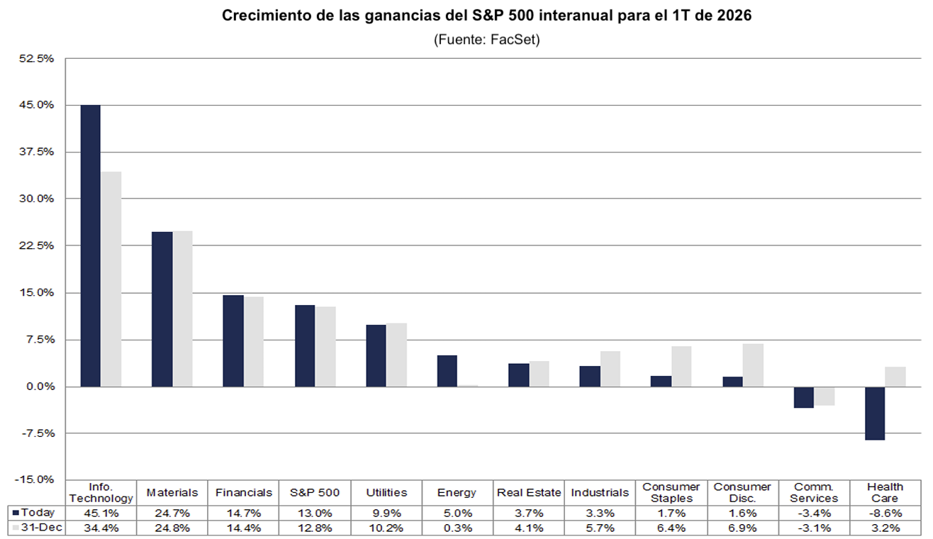 Para el 1T 2026, de acuerdo con FactSet, la tasa de crecimiento interanual estimada de los beneficios es del 13,0 %.