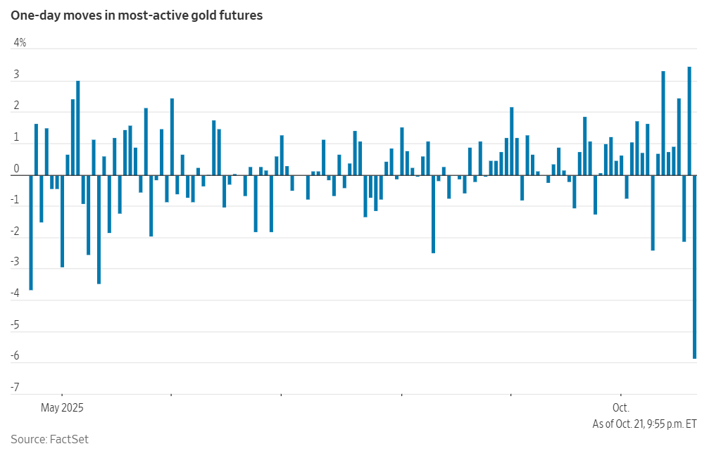 Spot gold fell by -5.36% to reach a one-week low of $4,121.65 per ounce, marking the most significant drop since August 2020. On Monday, prices had climbed to an all-time high of $4,381.21.