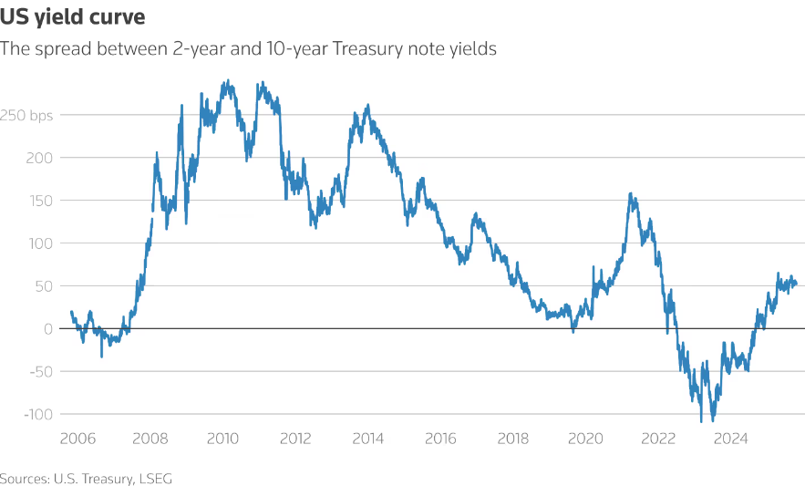 According to CME Group's FedWatch Tool, Fed funds futures traders are pricing in a 98.9% probability of a 25 bps rate cut at October’s FOMC meeting, higher than last week’s 97.3%. Traders are currently expecting 49.8 bps of cuts by year-end, higher than the 48.6 bps anticipated the prior week.