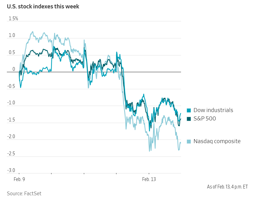 The S&P 500 edged up +0.05%, but still finished the week -1.85%, its steepest weekly fall since late November, when concerns over high technology valuations and ambitious AI investment plans prompted a similar pullback. The Dow Jones Industrial Average rose +0.10%, or 49 points, but ended the week -1.27%.
