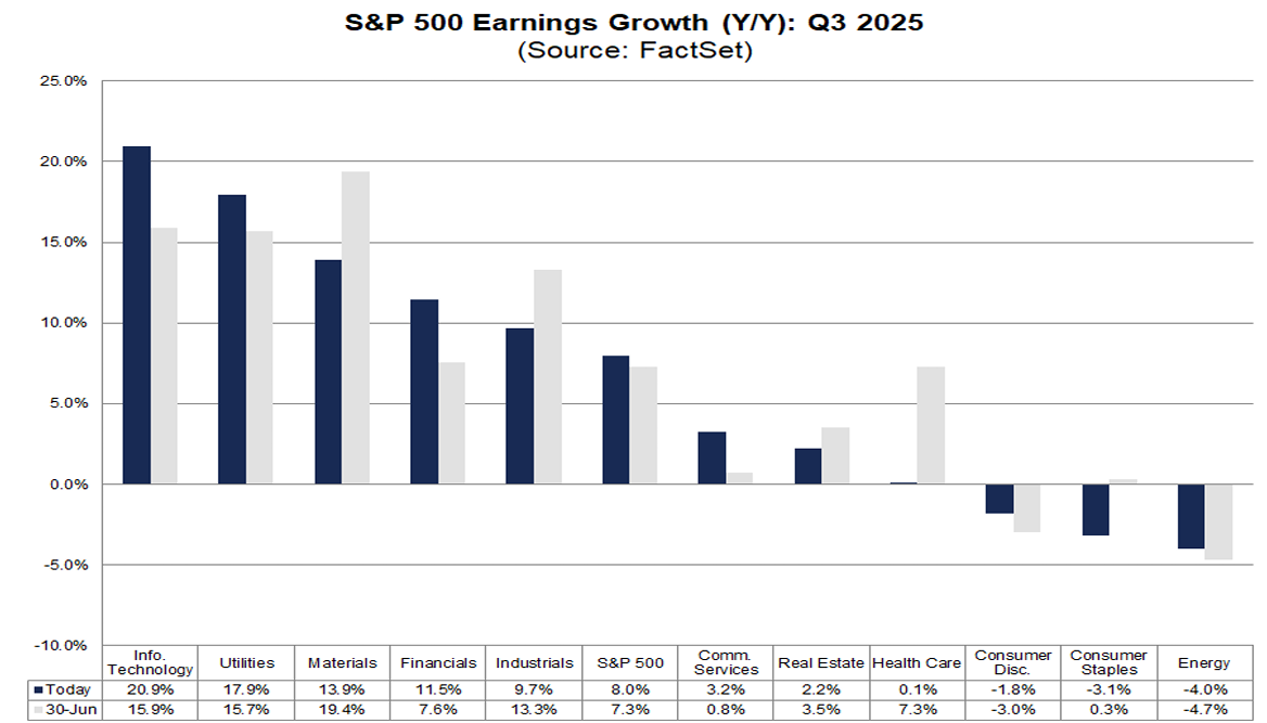 Sector-specific analysis indicates that five sectors are projected to see a y/o/y increase in their net profit margins for Q3 2025 compared to the same period in 2024. Utilities is expected to lead this growth with a 1.6 percentage point rise, moving from 14.8% to 16.4%.