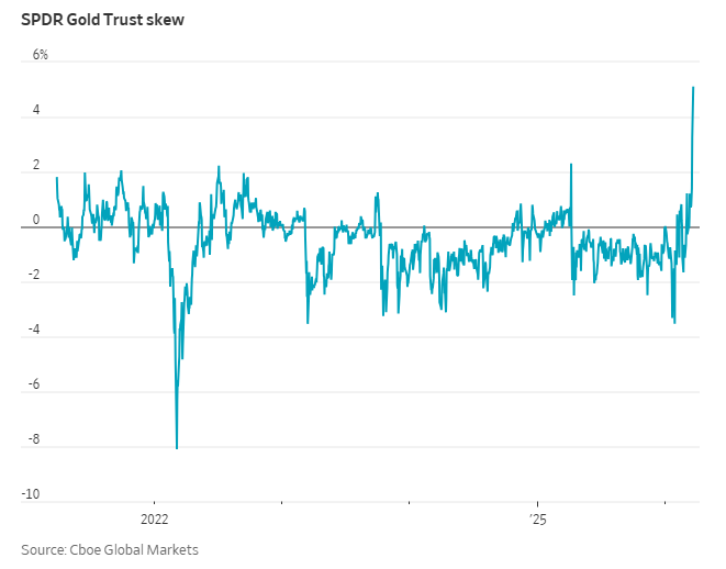 According to data from Cboe Global Markets, the ‘skew’ for options linked to the largest gold ETF has reached its highest level since at least 2021. This elevated skew indicates that bearish put options are commanding higher premiums compared to bullish call options, reflecting a greater demand for downside protection. Put options provide the right to sell at a specified price, whereas call options grant the right to buy.